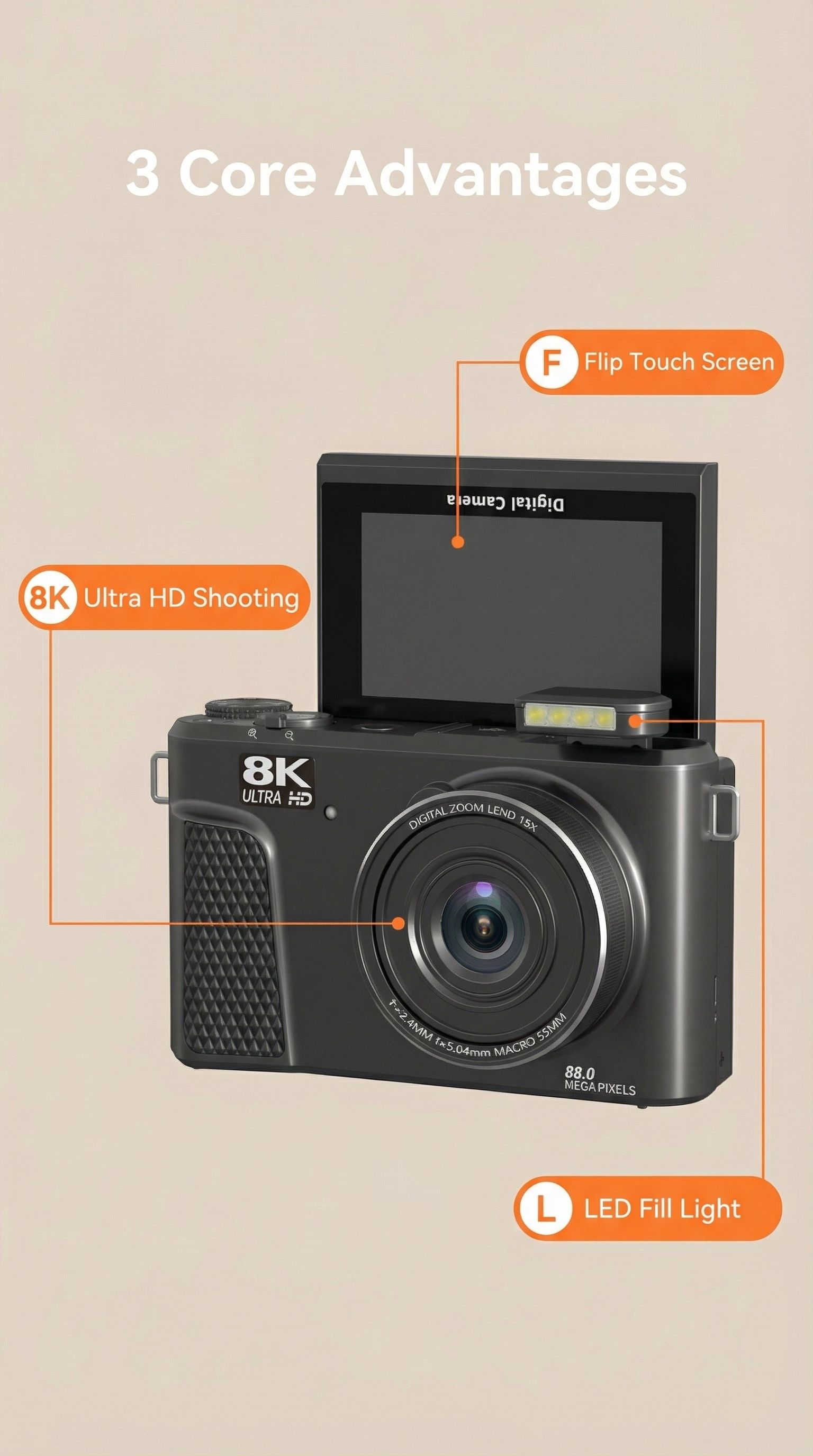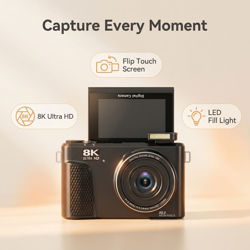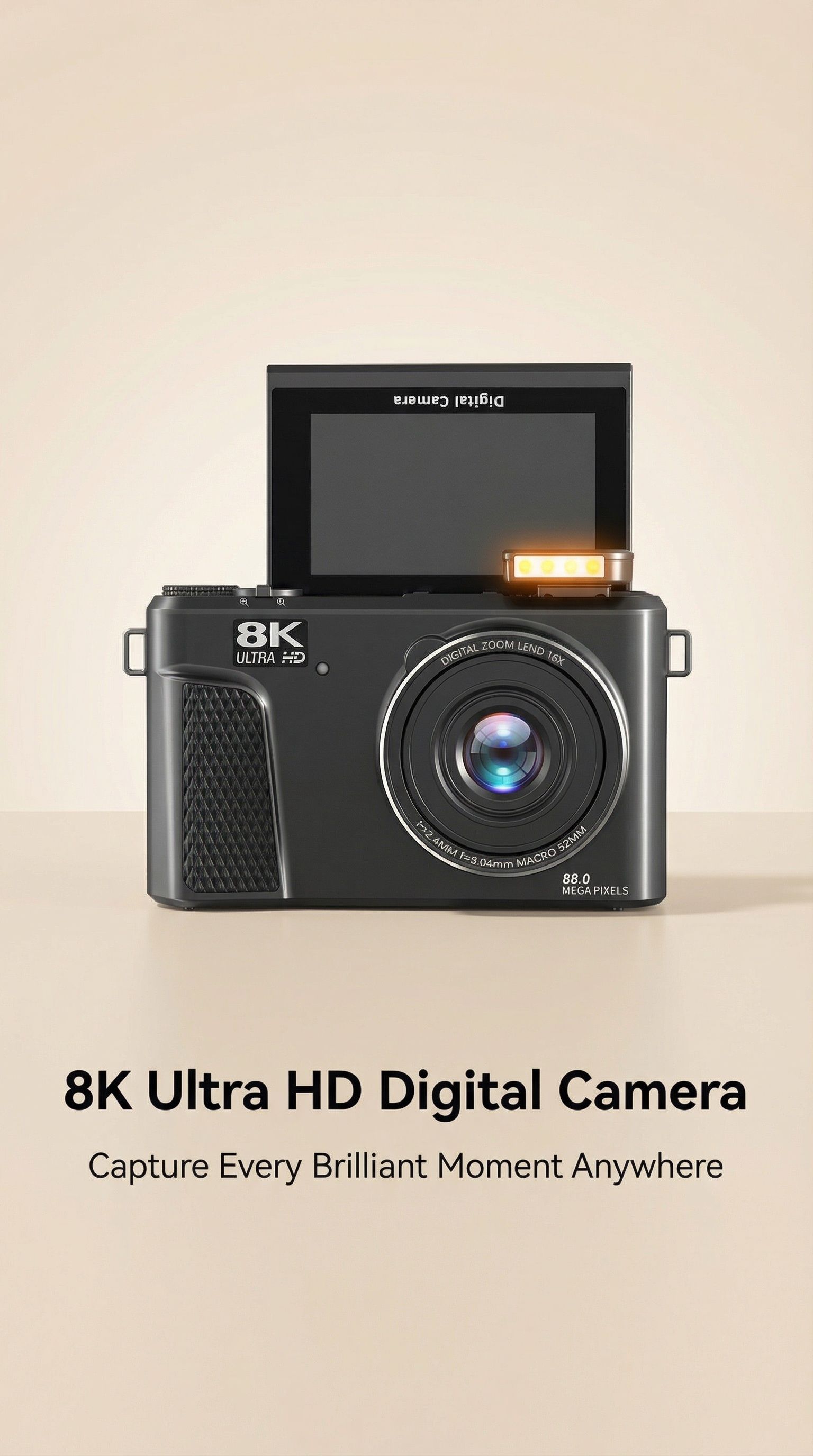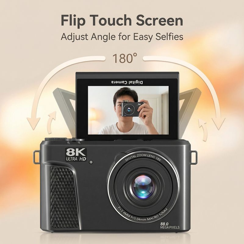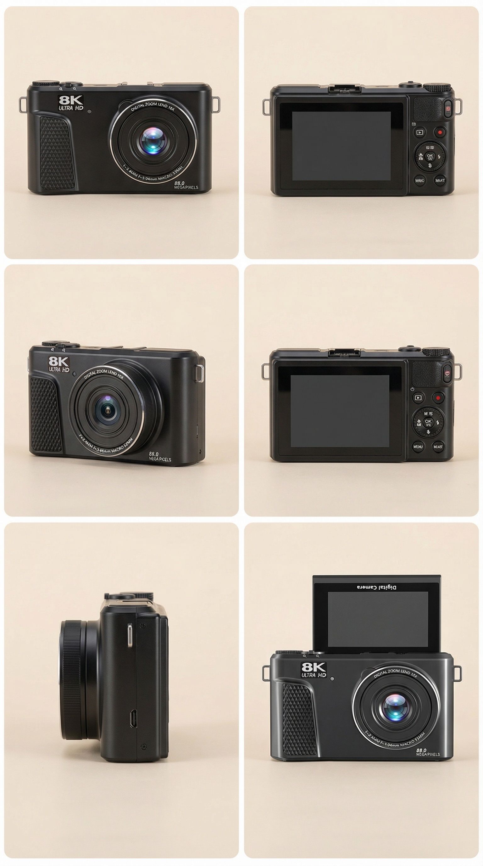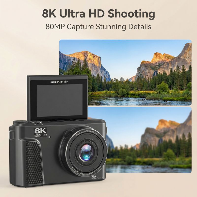 8K mirrorless digital camera with high resolution, flip screen, WiFi connectivity, and the ability to upload data to mobile phone cameras.