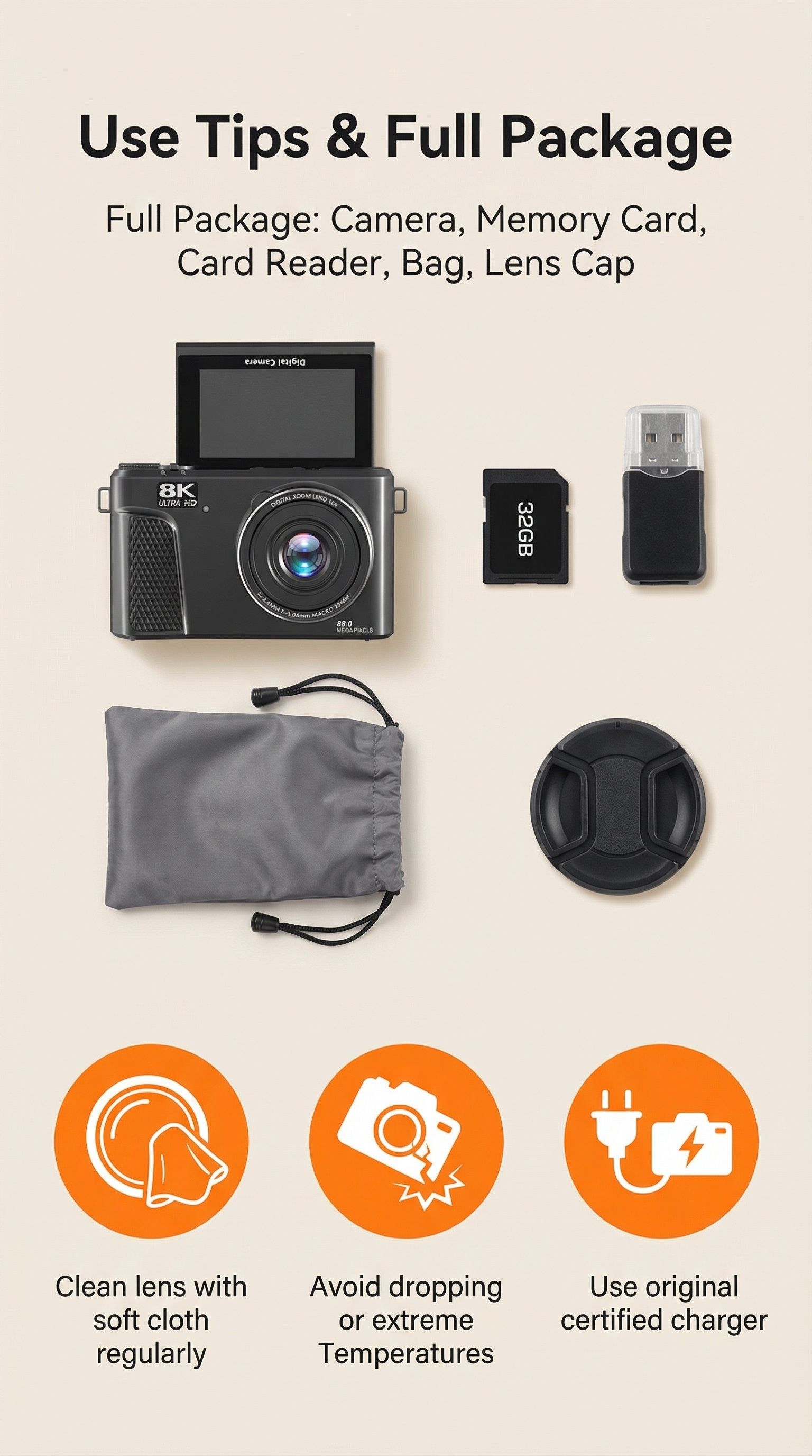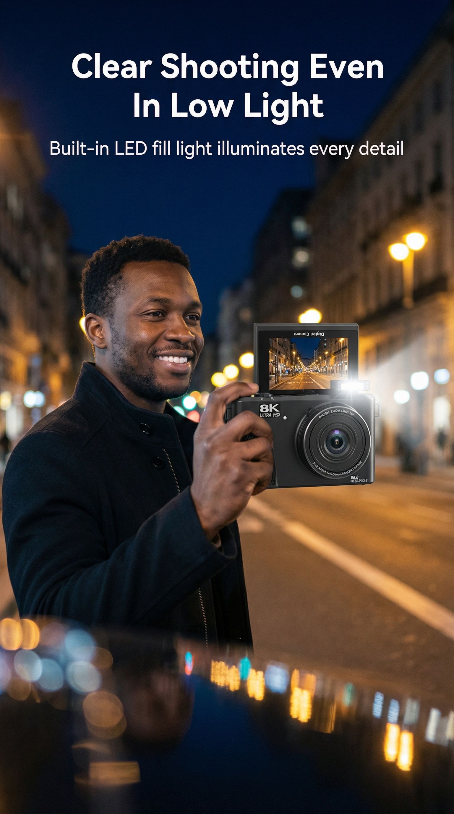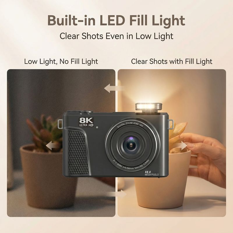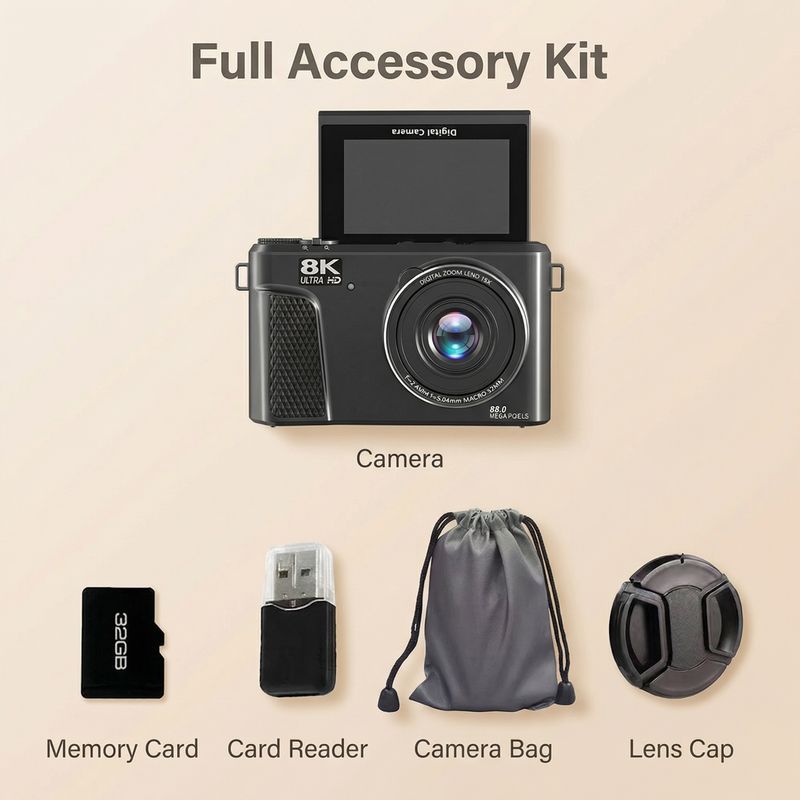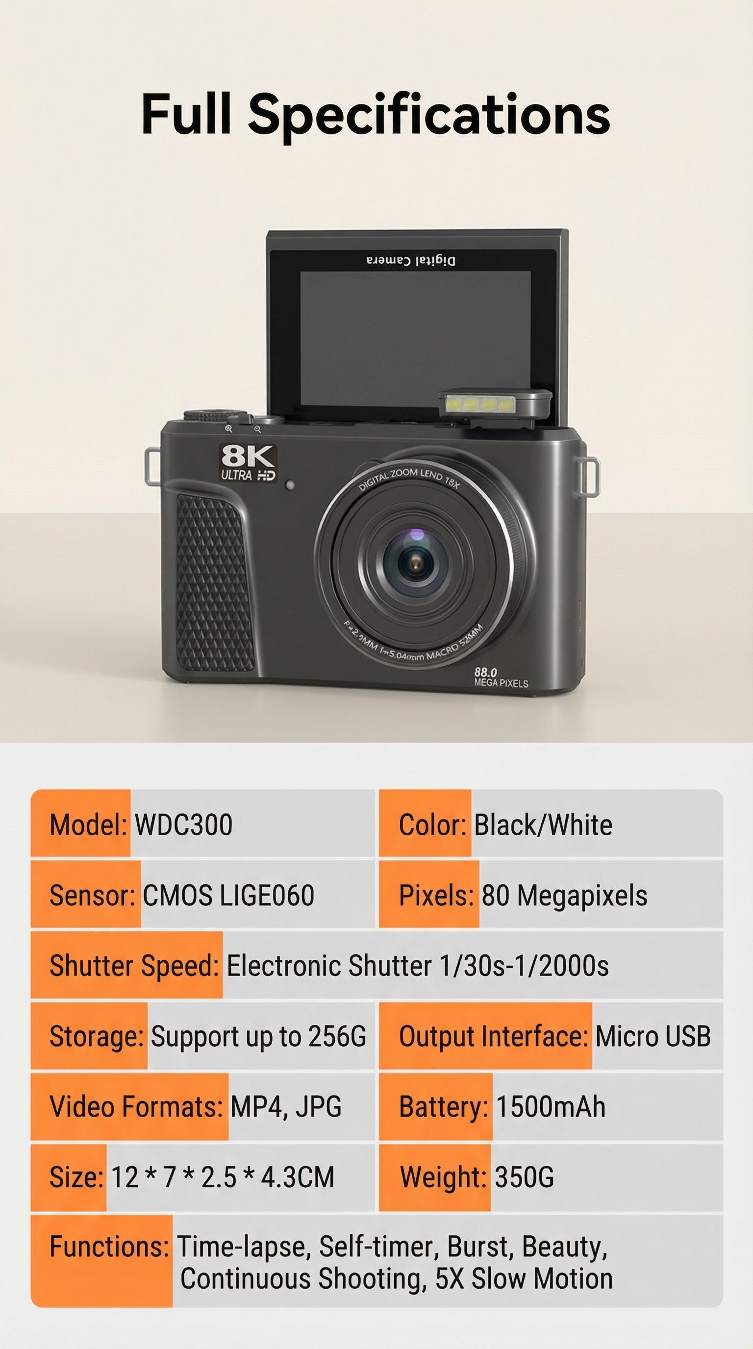 8K mirrorless digital camera with high resolution, flip screen, WiFi connectivity, and the ability to upload data to mobile phone cameras.