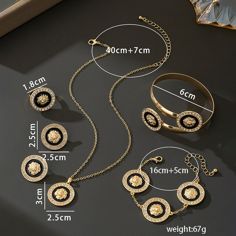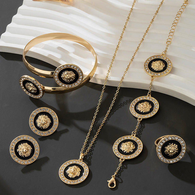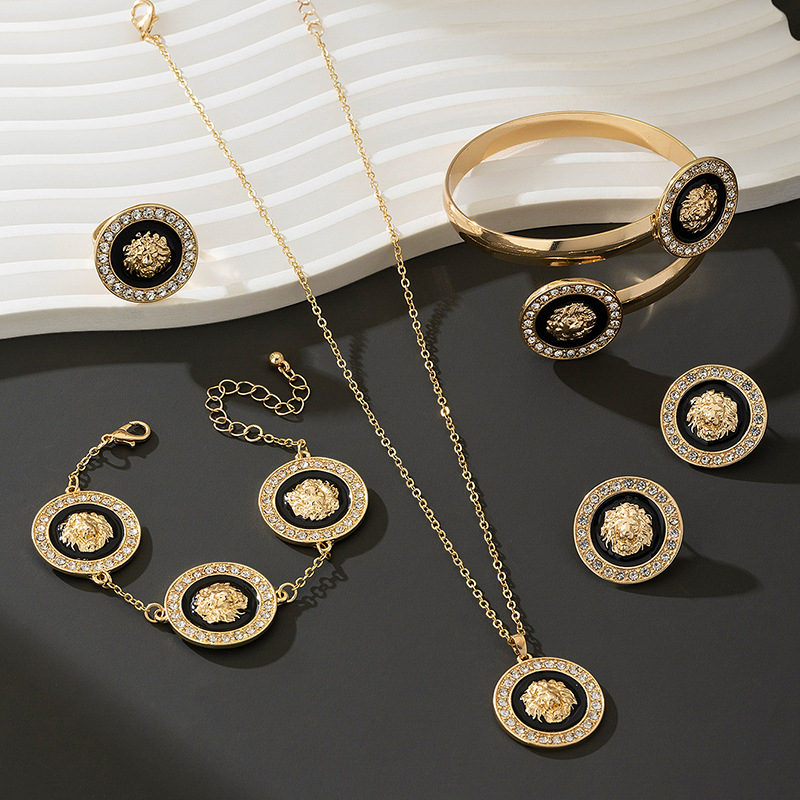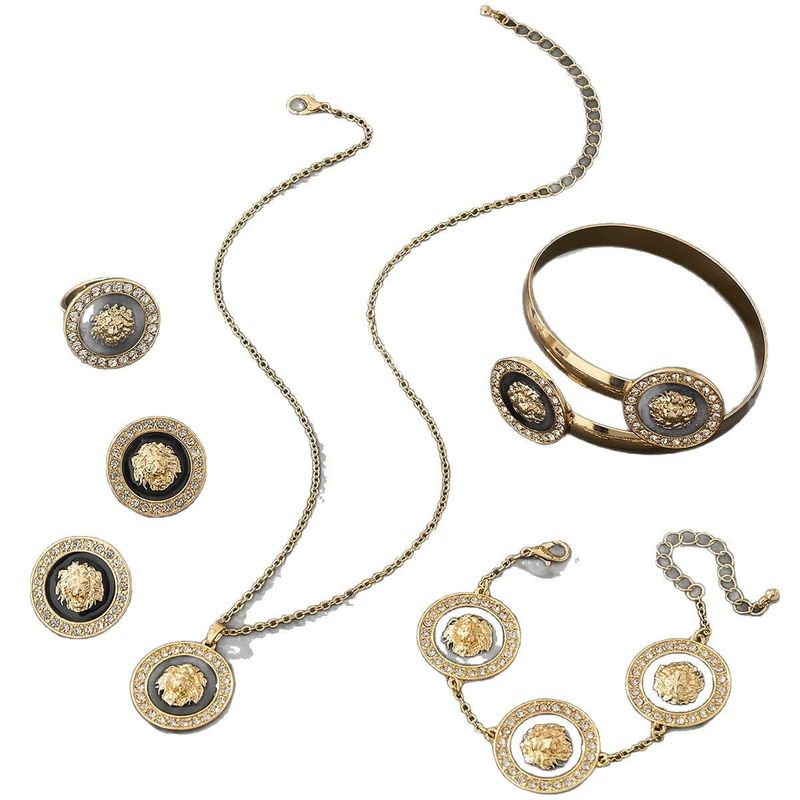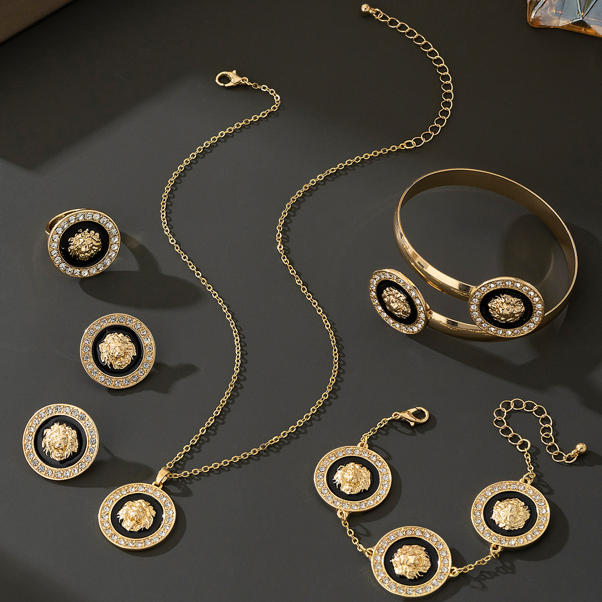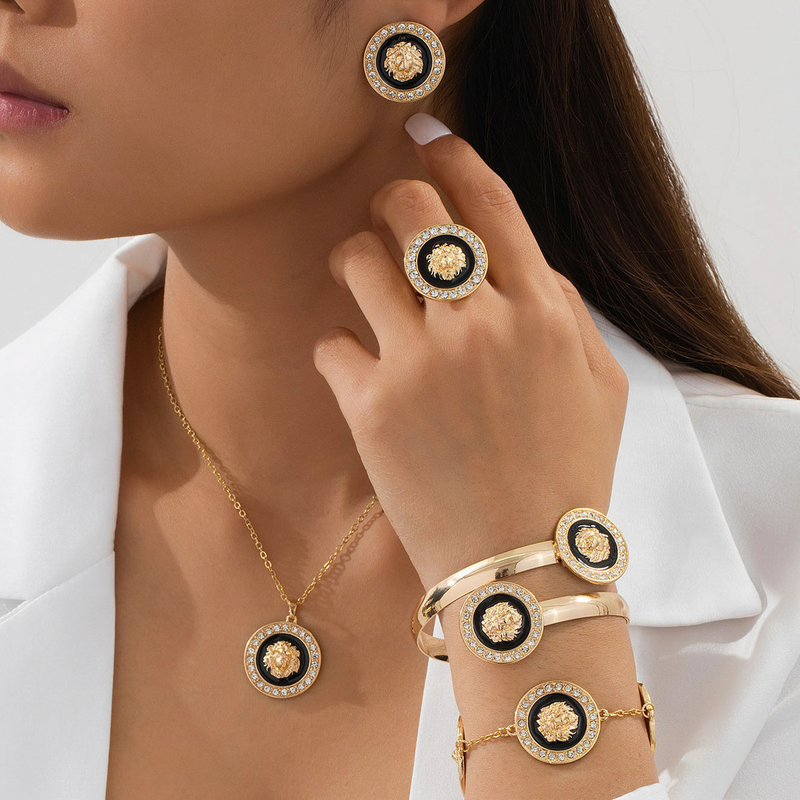 Lion head diamond pendant necklace, bracelet, earrings, ring, trendy and unique jewelry set