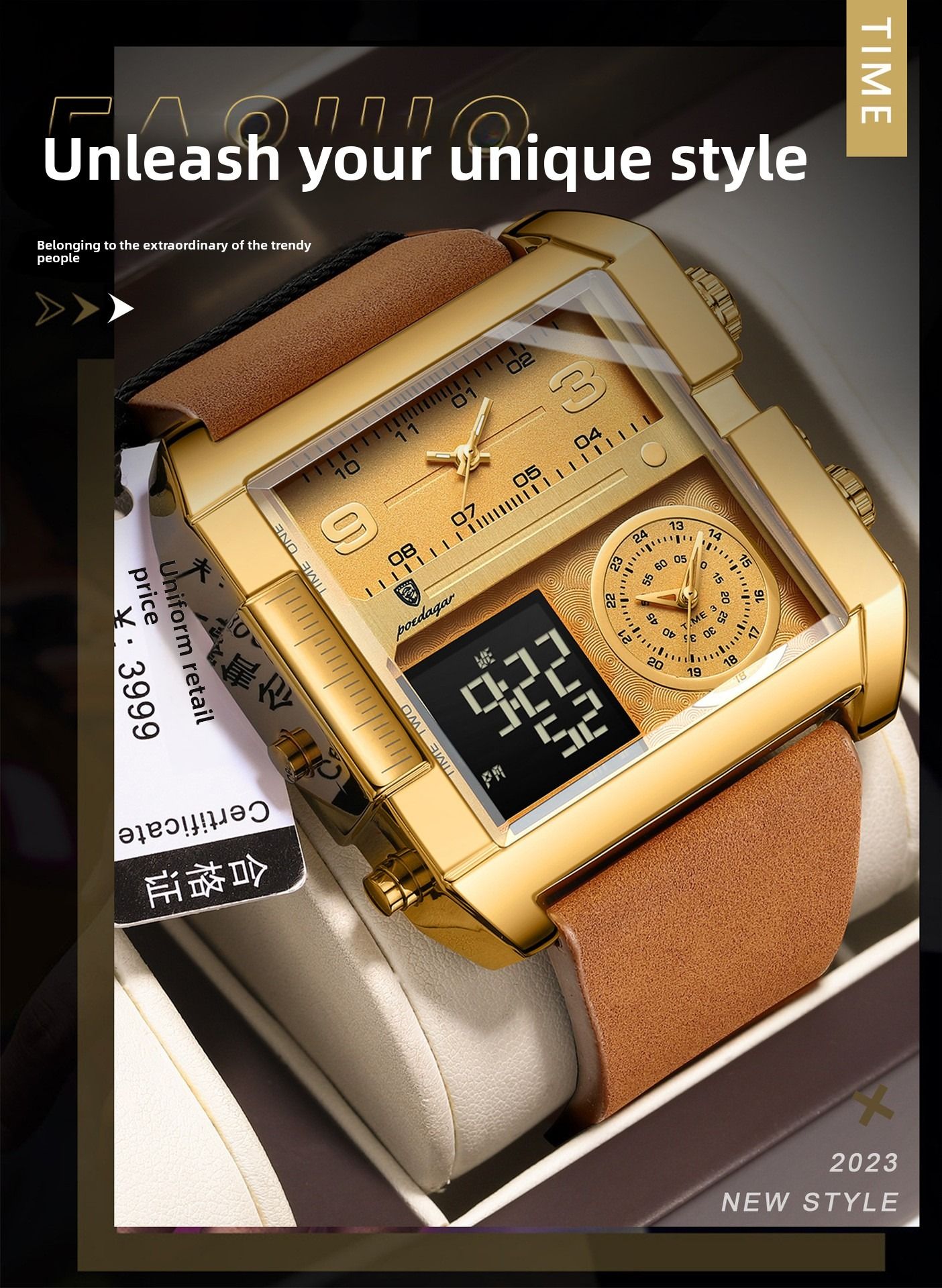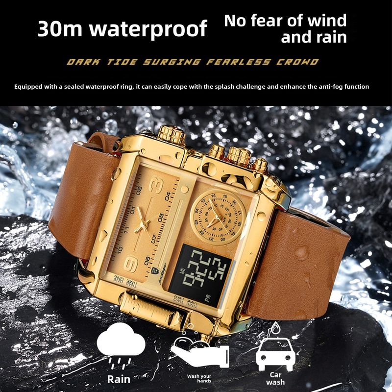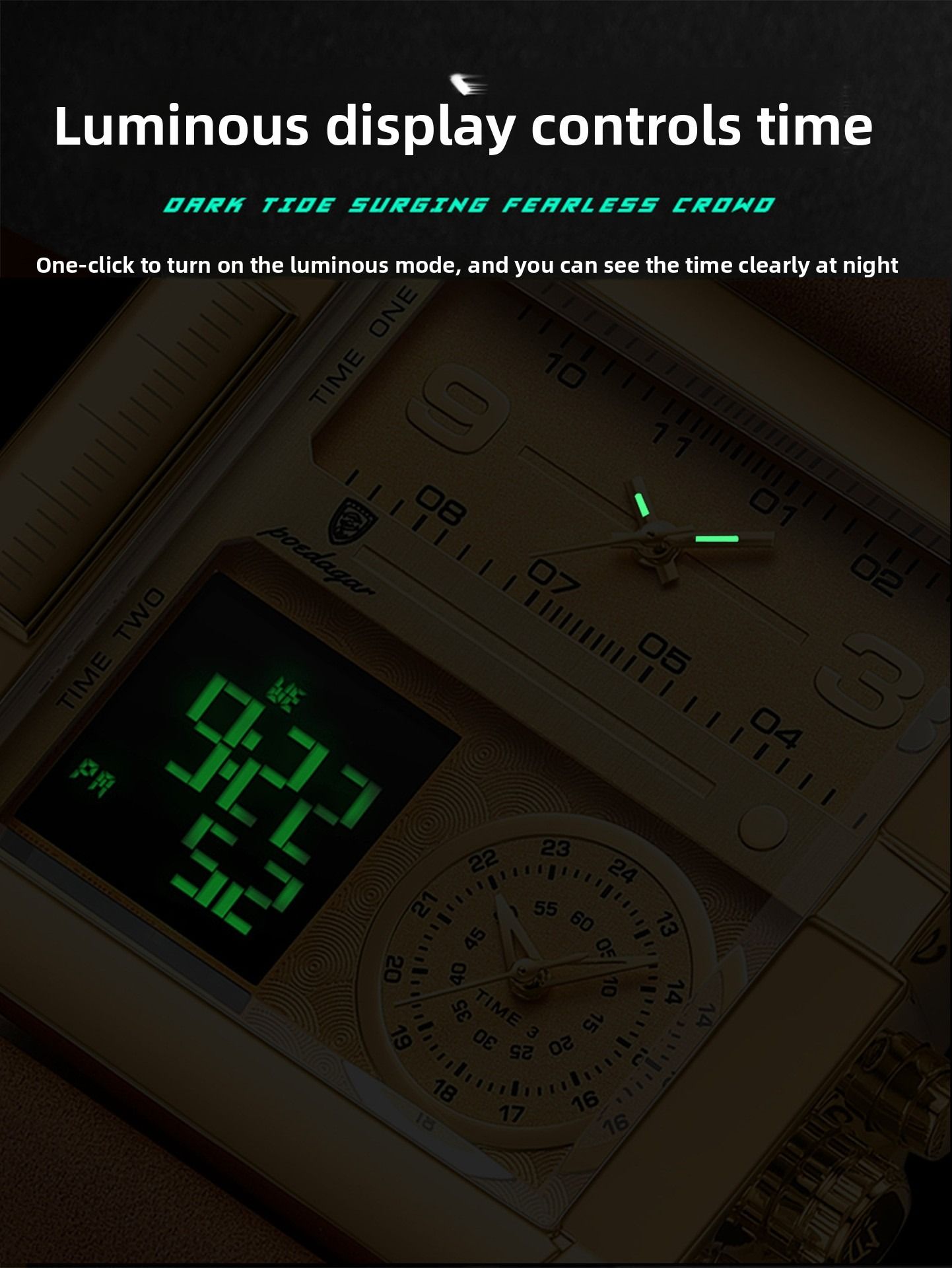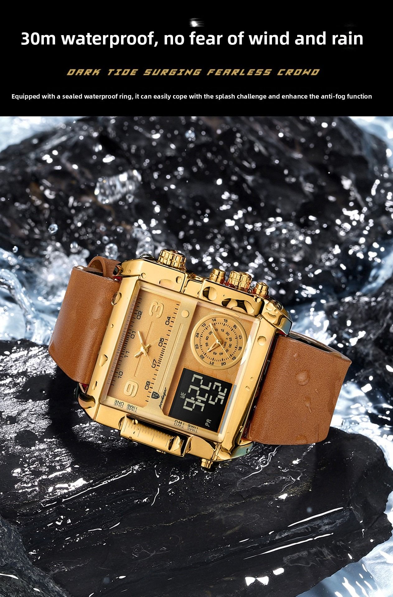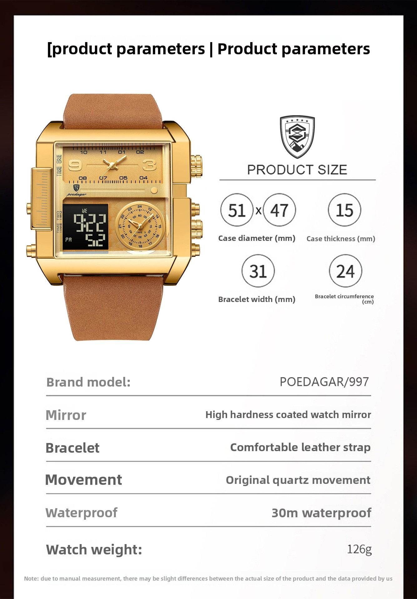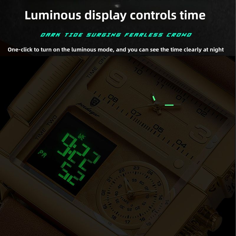 Stylish square digital watch with dual display, waterproof quartz wristwatch for men, featuring personalized waterproof luminous design.